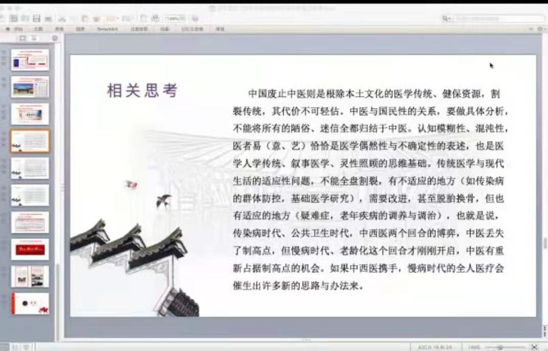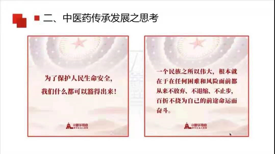 程老师的讲座分为两个部分,首先他带领我们回顾了百年党史上中医药的发展历程。接着分别从党领导中医药发展战略的变迁、党领导中医药在国家战略中的重要地位、党领导下中医药在外交领域的重大历史作用、党领导下中医药在突发的公共卫生事件中的生动实践等几大模块,详细地分析了党对中医药事业的全面引领。之后,程老师与我们分享关于中医药发展的一些思考。随着现代医学事业的发展,中医药文化自信也重新挺立,程老师也提出了一些对于中医药文化传播的路径创新,其中最为倡导的便是影视作品的创作。最后,他强调新时代大学生应争做“五好”学生,担当传承使命,大力发展中医药文化。