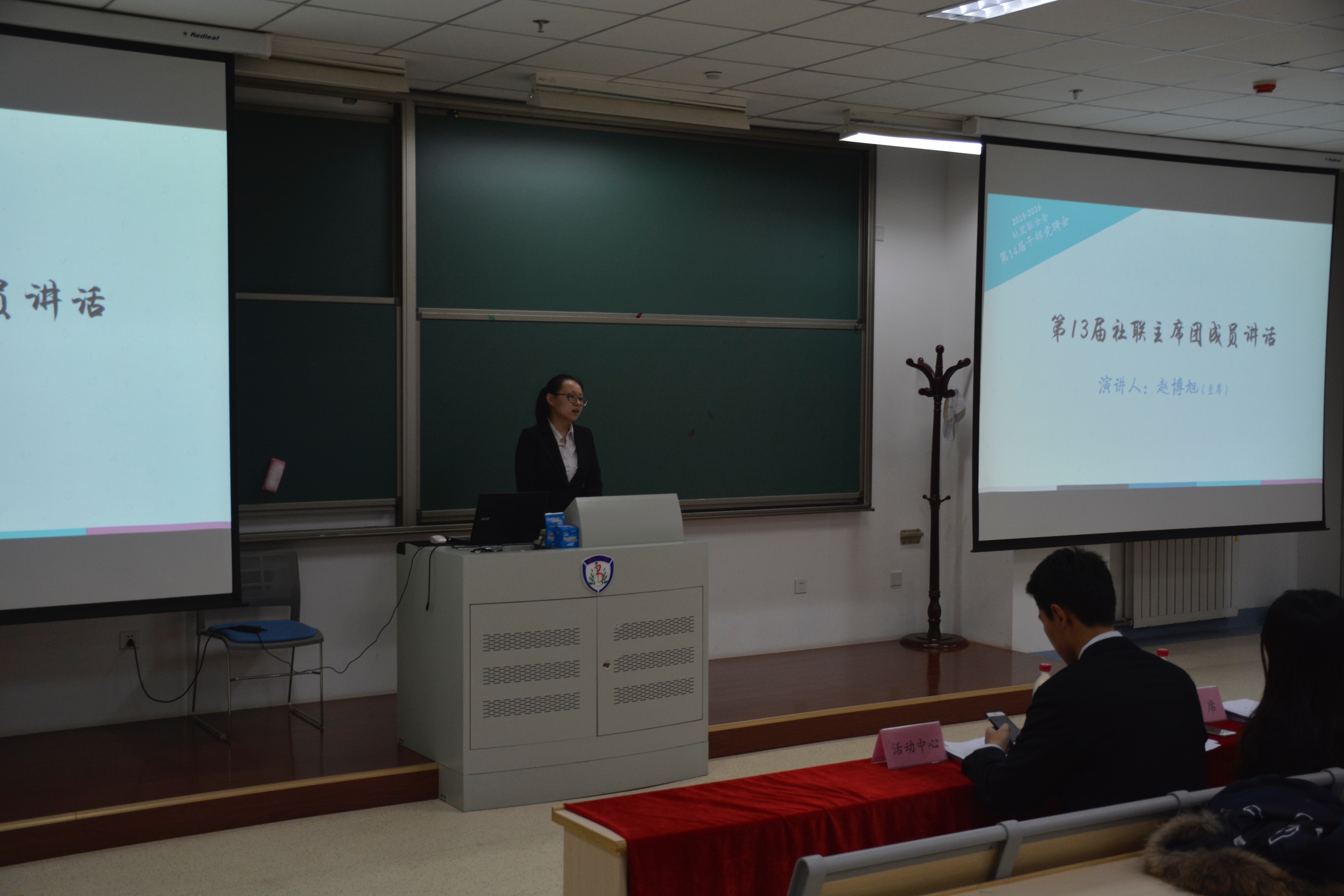 接下来,社联主席赵博旭上台讲话,与大家分享自己在社联工作的经历及感想,提到合作虽然看似简单,但是只有深刻的感触之后,才能体会到合作的力量。社联之所以能带给自己温暖,正是因为社联的每一位成员都能够积极地相互配合,共同完成任务。并强调社联就像是一个大家庭,希望新一届的干部们能将社联的这种精神继续传承下去。之后,主席团们也一一上台发言,对即将上任的干部们提出了宝贵的意见。