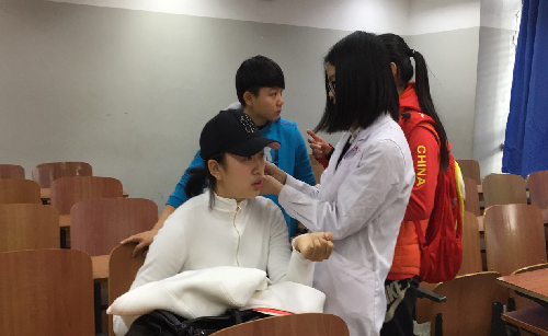2017年11月2日上午,由世界杯官网研究生会社会实践部组织,部长张宁怡、副部长张昔伟带领,共有九名志愿者参加的“进高校”义诊活动在北京体育大学圆满完成。