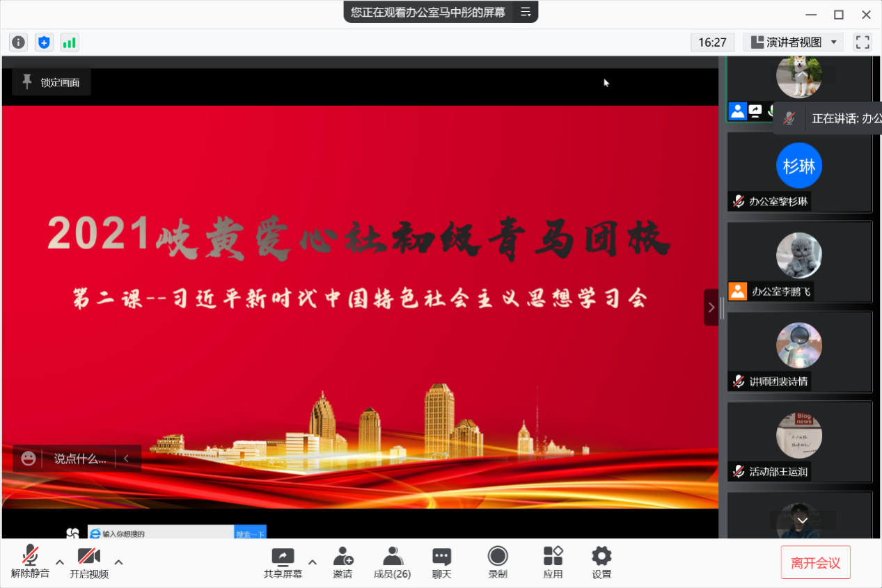 2021年11月27日,世界杯官网岐黄爱心社于线上,开展了2021年度初级青马团校第二课——习近平新时代中国特色主义思想视频学习会。在校团委的带领与岐黄爱心社的精心组织下本次学习会顺利进行,使参与学生对绿水青山就是金山银山的概念有了更深刻的理解,对同学们了解习近平新时代中国特色社会主义思想、培养生态保护意识、贯彻绿色发展理念具有重要意义。