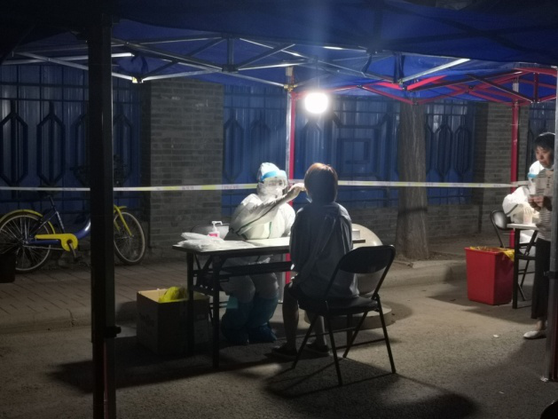 大兴区体育中心采集点,志愿者正在进行核酸检测样本采集