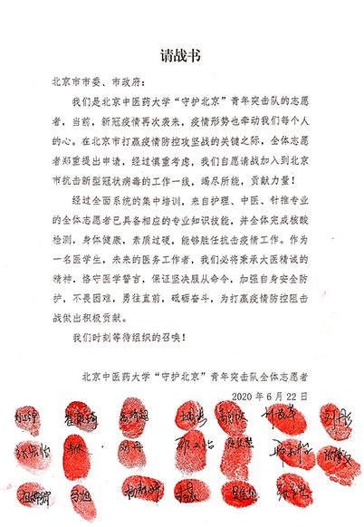 自接到北京市紧急任务以来,学校迅速启动“守护计划”,仅在6月20日一天内就完成了200名志愿者的火速招募和集结,并在望京校区对全体志愿者进行了为期3天的集中培训和实操演练。6月23日,由校团委、中医学院、针灸推拿学院、护理学院及各临床附属医院抽调的10名辅导员和10名一线临床护士组成的指导教师团队与首批志愿者一起出征前往大兴区驻地,奔赴一线开展志愿服务工作。
