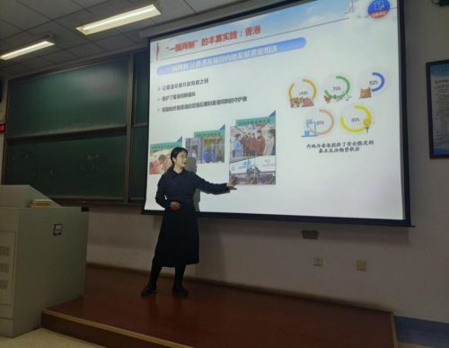徐娜老师围绕“志存高远,开放包容”这一主题,从“一国两制”的理论基础和发展沿革、“一国两制”在香港和澳门的丰富实践、新时代中国共产党解决台湾问题的总体方略等方面讲解。徐老师以港澳回归祖国过程中的一系列重大历史事件展开讲述,用音频和课件相结合的方式加深同学们的情感认同。之后徐老师对“一国两制”政策进行具体解读,举出大量港澳生活实例来表明“一国两制”政策才是港澳持续繁荣发展的不竭动力。在课程临近结束时,徐老师播放歌曲《2035去台湾》,举出强而有力的历史证据证明台湾自古以来就是中国的一部分,任何台独势力终会被和平统一的浪潮所瓦解,所淹没!这激动人心的话语,增强了同学们对海峡两岸必将和平统一的信心。