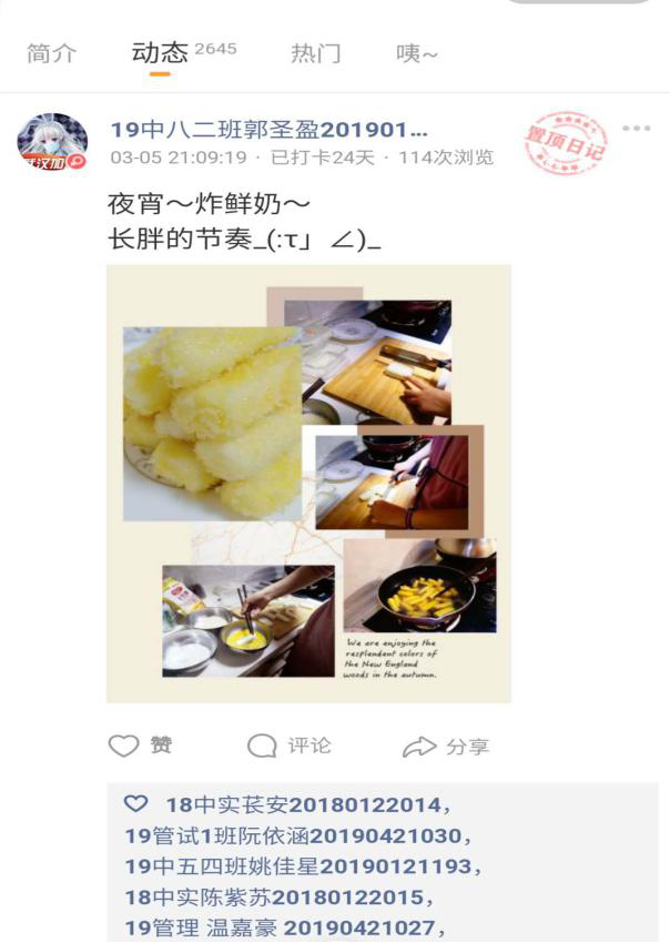 活动期间,生活权益部共推出七个彩蛋活动,分别为:十七年照片对比、隔空拥抱、ppt大海展示、20200222比耶送祝福、爸妈经典语录分享、晒晒最低微信步数和我记忆中的校园生活。彩蛋活动每周在微信群中随机掉落,同学们可自愿参加,不影响打卡率。彩蛋活动形式简单且富有趣味,丰富了居家大作战的活动内涵,同时使同学们参与打卡的热情更盛。同学们在参与彩蛋活动的过程中发现生活中的爱,传递祝福,热爱生活,不断增强抗疫信念。
