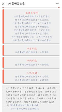 考研复试经验分享,涵盖10余个专业考研方向,并分为专业型硕士和学术型硕士,共推送了13期,目前总点击量为9492次;执业医师考试经验分享,主要分为中医和中西医结合方向,并以笔试和实操两类考试进行分类推送,共推送了6期,目前总点击量为1667次。两个模块的经验分享内容简洁、生动、实用性强、含金量高,并涉及我校多个专业、考试方向。活动一推出,深受学生好评,也得到广大研究生的支持。